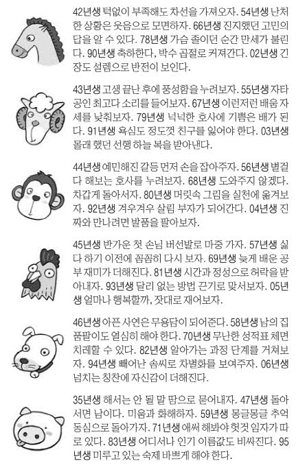 - 띠별 운세: 태어난 해의 동물띠(12간지)에 따라, 재물·직업·건강 등 실질적 운세 중심