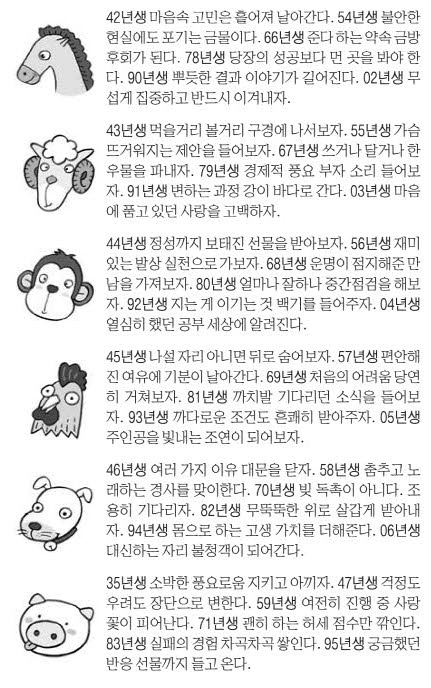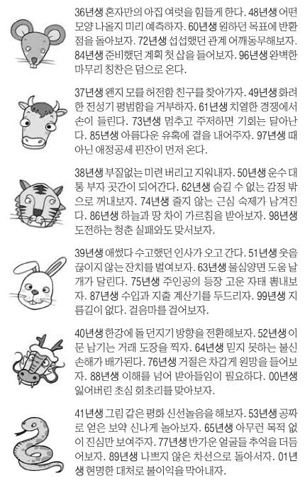| 쥐띠 | 인내와 자기 해결 강조 | 남 탓하지말고 자신의 선택을 지키세요. 계획대로 밀고나가는 힘이 필요 |