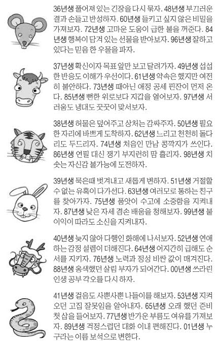 | 쥐띠 | 능력 인정, 일복 터지는 날. 실패 경험 재도전하면 성공 | 주변 도움, 협업, 대표직 제안 수락 추천 |