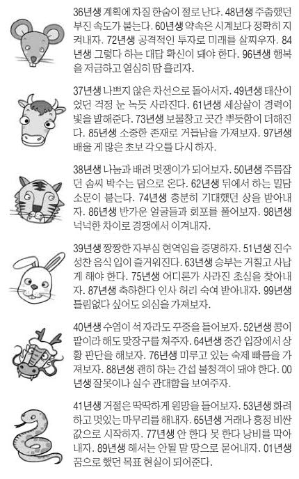 | 쥐띠 | 계획성과 신중함 | 사업·투자에선 부정확한 정보 주의, 체력 회복에 신경쓰기 |