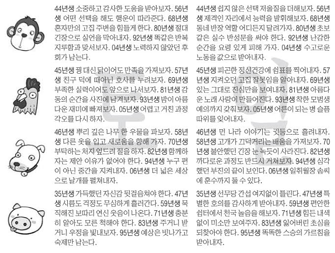 | 원숭이띠 | 기회 포착, 밝은 해답 | 주변 도움 받기, 걱정보다는 희망 |