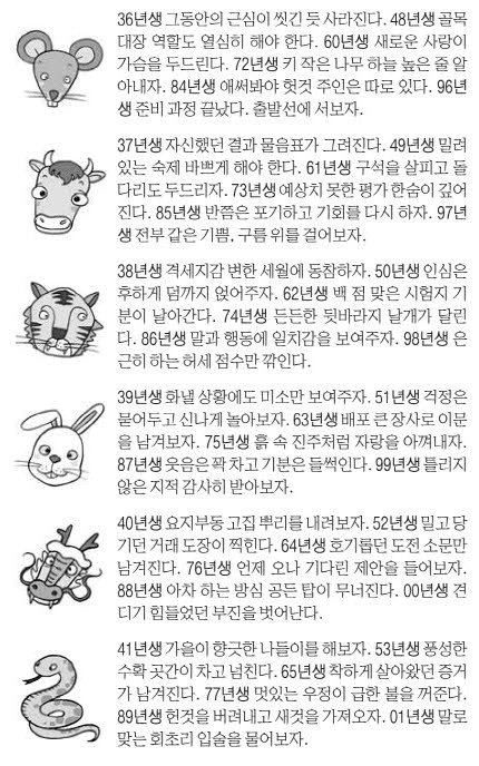 | 닭띠 | 결과보단 과정, 작은 실수 극복 필요 | 반복점검과 협의, 꼼꼼하게 확인 |