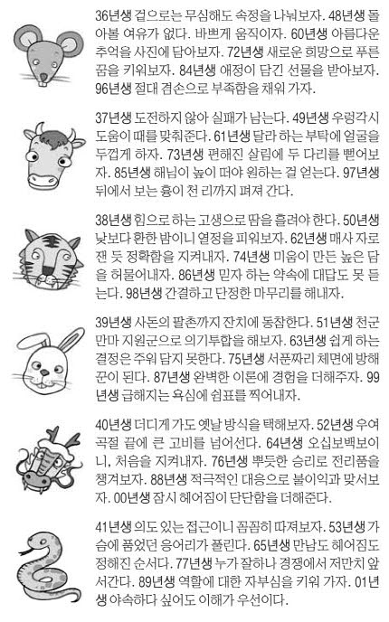 | 용띠 | 행복은 가까이, 현실적 목표 집중 | 불필요한 집착 금지, 적극적 행동 |