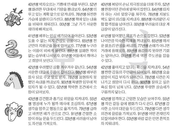 | 뱀띠 | 컨디션관리·계약운 | 복잡한 결정 피하고, 정보·계약 꼼꼼히 |