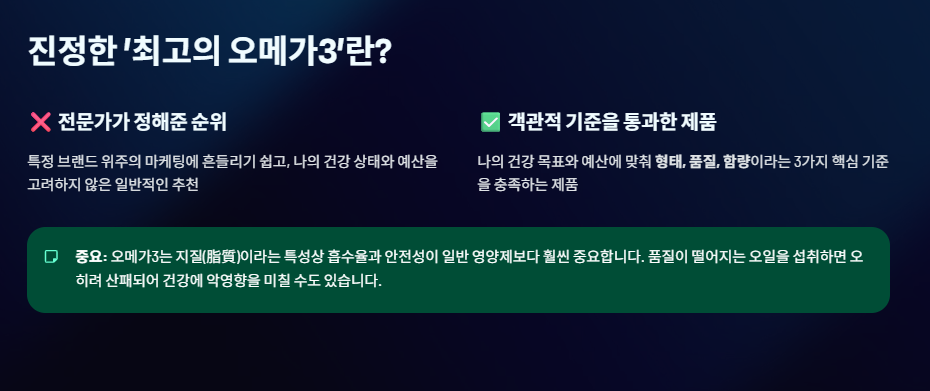 진정한 '최고의 오메가 3'는 전문가가 정해주는 순위가 아니라, 나의 건강 목표와 예산에 맞춰 객관적인 기준을 통과한 제품입니다.