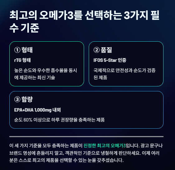 최고의 오메가 3는 높은 흡수율의 rTG 형태이면서, IFOS 5-Star 인증으로 안전이 검증되었으며, EPA+DHA 합산량이 1,000mg 내외인 제품을 고르는 것이 핵심입니다.