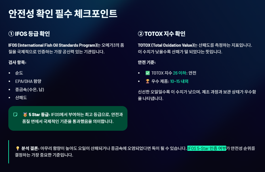 💡 분석 결론: 아무리 함량이 높아도 오일이 산패되거나 중금속에 오염되었다면 독이 될 수 있습니다. IFOS 5-Star 인증 여부가 안전성 순위를 결정하는 가장 중요한 기준입니다.