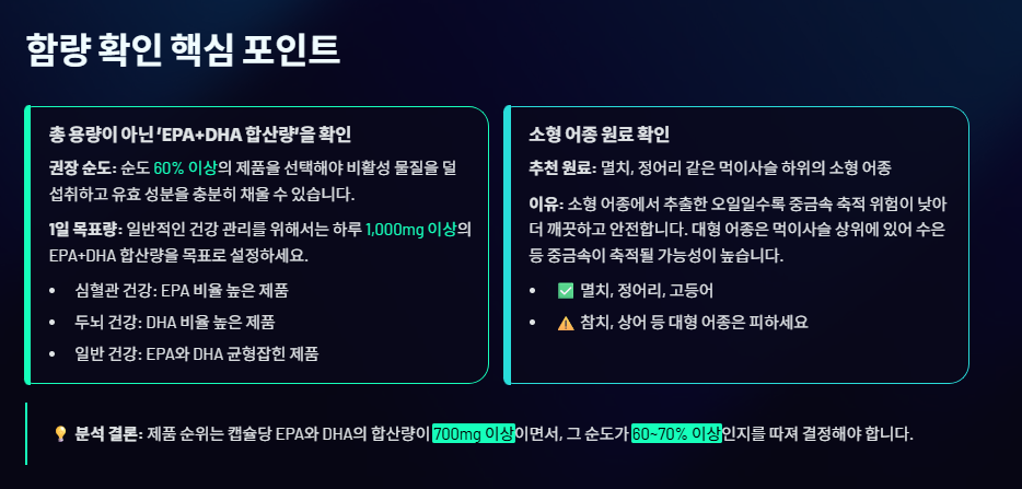 💡 분석 결론: 제품 순위는 캡슐당 EPA와 DHA의 합산량이 700mg 이상이면서, 그 순도가 60~70% 이상인지를 따져 결정해야 합니다.