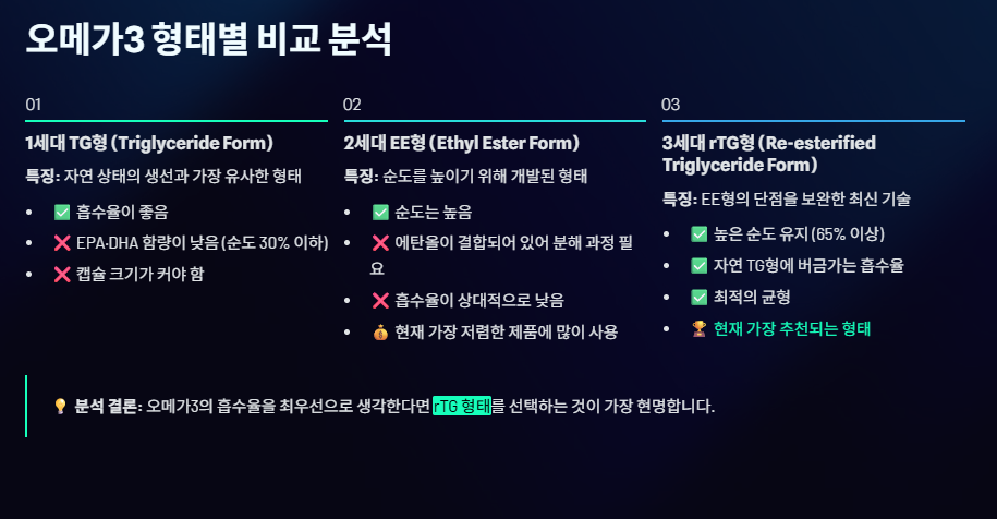 💡 분석 결론: 오메가 3의 흡수율을 최우선으로 생각한다면 rTG 형태를 선택하는 것이 가장 현명합니다.