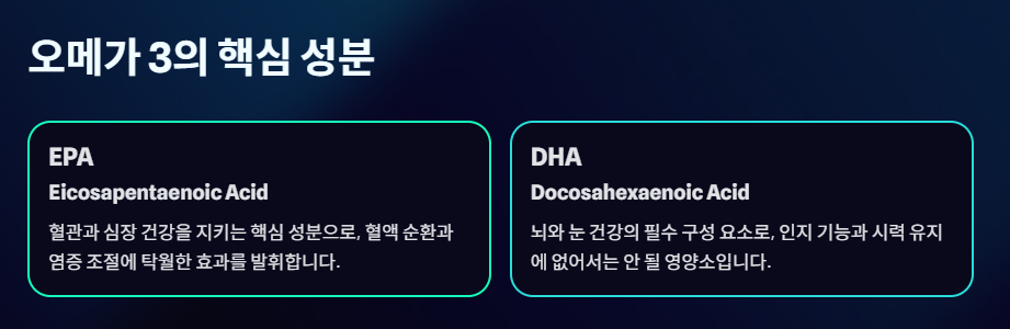 오메가 3는 EPA를 통해 혈관을 보호하고 DHA를 통해 두뇌와 눈을 구성하며, 전반적인 만성 염증 반응을 낮춰 건강한 노화를 돕는 필수 지방산입니다.