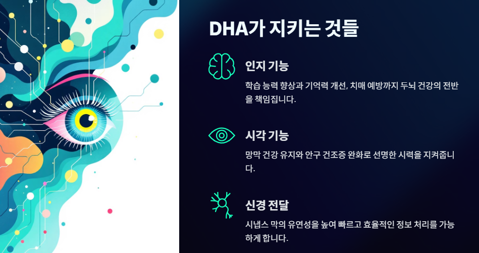 오메가 3의 또 다른 핵심 성분인 **DHA(Docosahexaenoic Acid)**는 뇌와 눈 건강에 없어서는 안 될 '특급 지방산'입니다.
