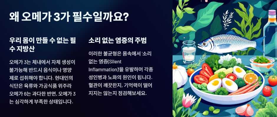 현대인의 식단은 육류와 가공식품 위주라 오메가 6 지방산은 과도한 반면, 오메가 3는 심각하게 부족한 불균형 상태입니다. 이 불균형은 우리 몸속에서 **'소리 없는 염증(Silent Inflammation)'**을 유발하며 각종 성인병과 노화의 주범이 됩니다.