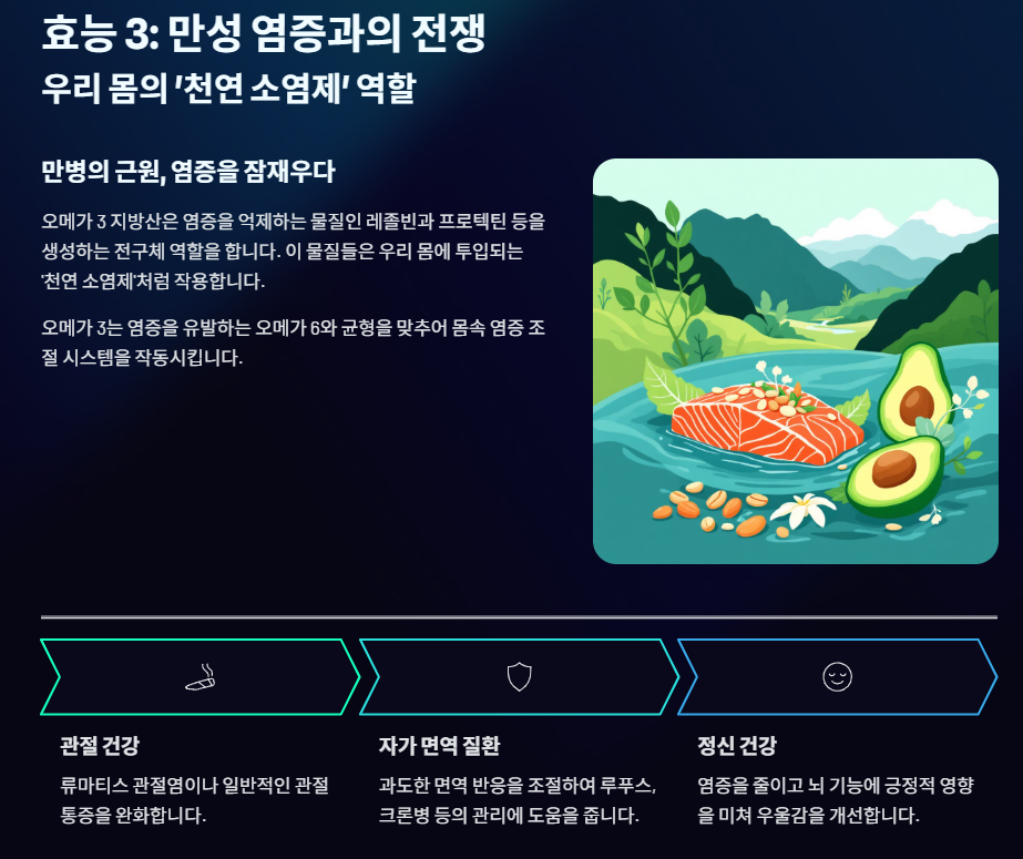 결론적으로, 오메가 3는 혈관을 맑게 하고 두뇌 기능을 지원하며, 나아가 만성 질환의 근원인 염증을 근본적으로 조절하는 가장 강력하고 필수적인 영양소입니다.