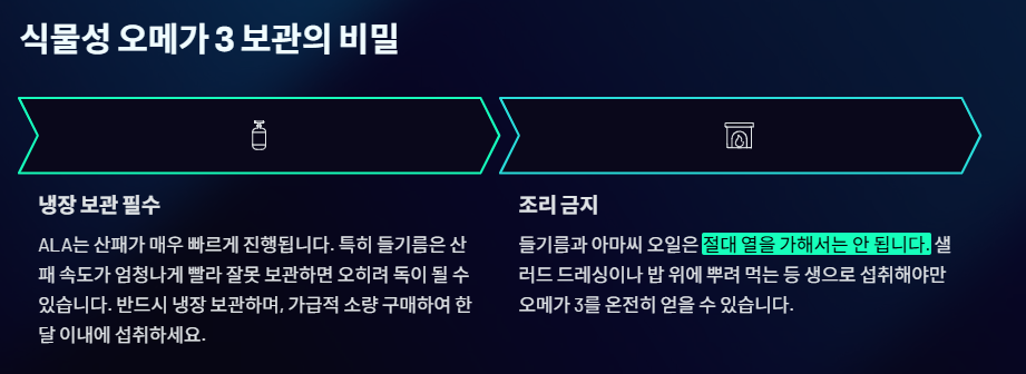 ALA 역시 산패가 매우 빠르게 진행됩니다. 특히 들기름은 산패 속도가 엄청나게 빨라 잘못 보관하면 오히려 독이 될 수 있습니다.