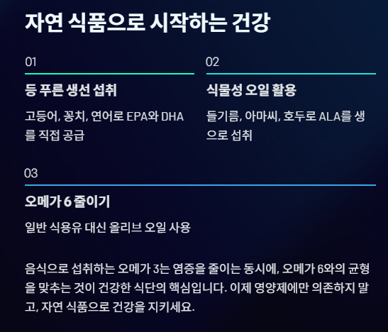 음식으로 섭취하는 오메가 3는 염증을 줄이는 동시에, 오메가 6와의 균형을 맞추는 것이 건강한 식단의 핵심입니다.