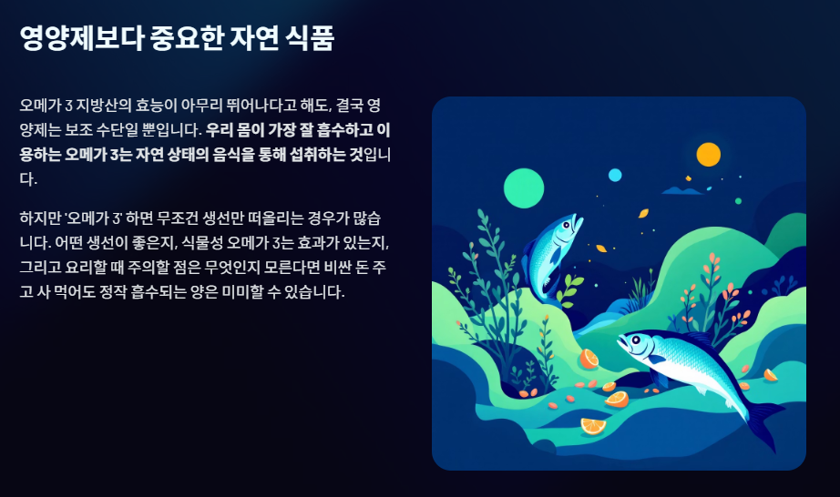 오메가 3 지방산의 효능이 아무리 뛰어나다고 해도, 결국 영양제는 보조 수단일 뿐입니다. 우리 몸이 가장 잘 흡수하고 이용하는 오메가 3는 자연 상태의 음식을 통해 섭취하는 것입니다.