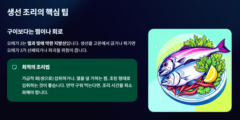 오메가 3는 열과 빛에 약한 지방산입니다. 생선을 고온에서 굽거나 튀기면 오메가 3가 산패되거나 파괴될 위험이 큽니다.
