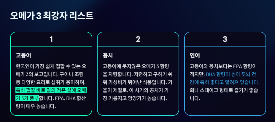 - 고등어: 한국인이 가장 쉽게 접할 수 있는 오메가 3의 보고입니다. 구이나 조림 등 다양한 요리로 섭취가 용이하며, 특히 껍질 바로 밑의 검은 살에 오메가 3가 풍부합니다. (EPA, DHA 합산량이 매우 높음)