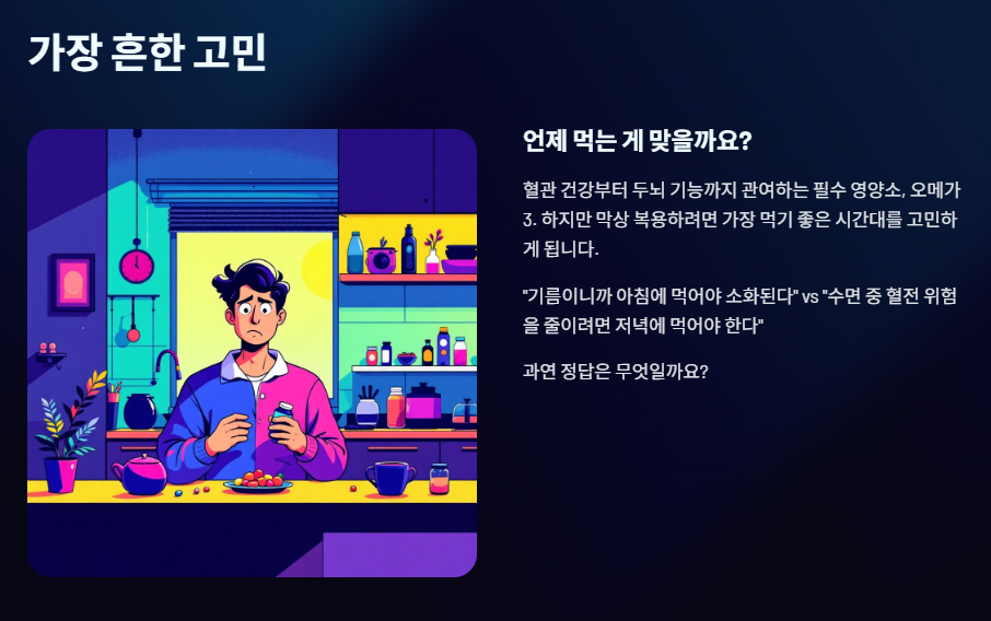 오메가 3는 '식후' 복용이 기본이지만, 하루 중 어느 시점의 식후에 먹느냐에 따라 기대할 수 있는 신체적 시너지가 다릅니다.