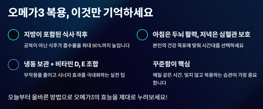 👉 결론: 오메가 3는 지방이 포함된 식사 직후에 먹는 것이 흡수율 면에서 가장 현명한 복용 시간입니다.