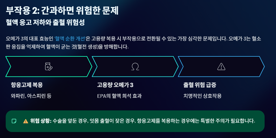 오메가 3의 효능인 **'혈액 순환 개선'**은 고용량 복용 시 부작용으로 전환될 수 있는 가장 심각한 문제입니다. 오메가 3는 혈소판 응집을 억제하여 혈액이 굳는 것(혈전 생성)을 방해합니다.