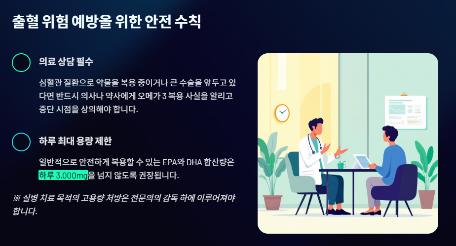 - 🚨 의료 상담 필수: 심혈관 질환으로 약물을 복용 중이거나 큰 수술을 앞두고 있다면 반드시 의사나 약사에게 오메가 3 복용 사실을 알리고 중단 시점을 상의해야 합니다.