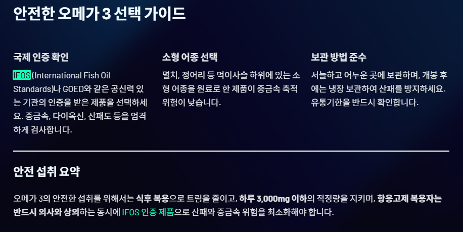 - 국제 인증 확인: **IFOS (International Fish Oil Standards)**나 GOED와 같은 공신력 있는 기관의 인증을 받은 제품을 선택하세요. 이들 기관은 중금속, 다이옥신, 산패도 등을 엄격하게 검사합니다.