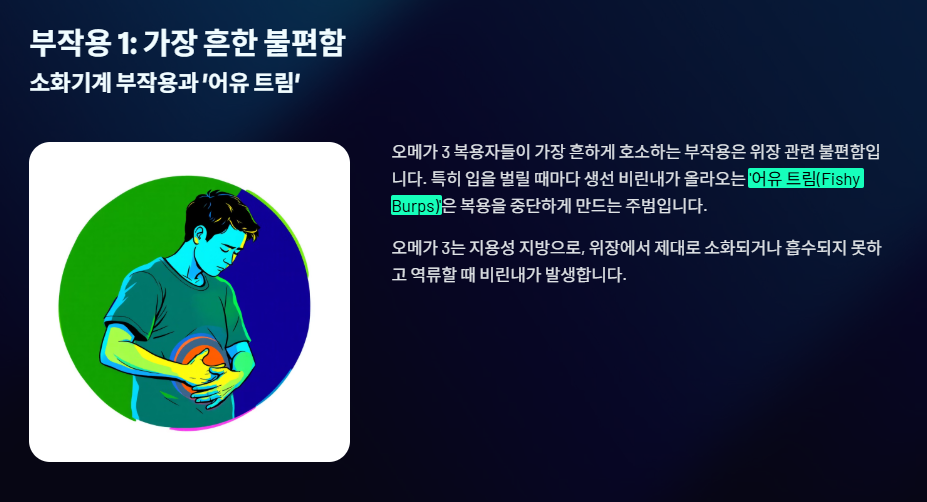 오메가 3 복용자들이 가장 흔하게 호소하는 부작용은 위장 관련 불편함입니다. 특히 입을 벌릴 때마다 생선 비린내가 올라오는 **'어유 트림(Fishy Burps)'**은 복용을 중단하게 만드는 주범입니다.