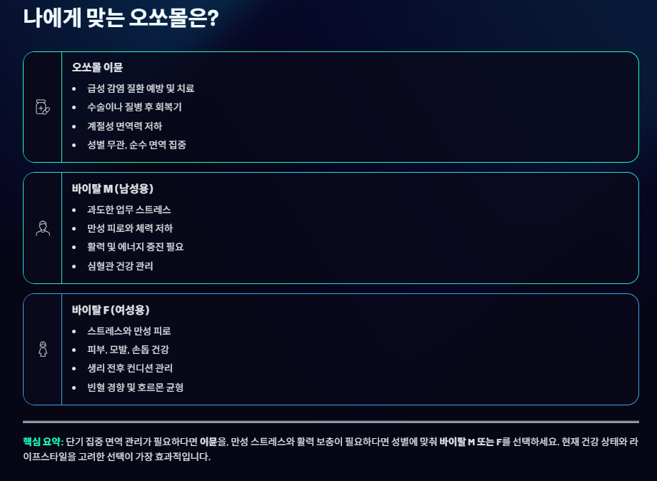 - 단기간 집중적인 면역 방어나 질병 후 회복이 필요하다면 오쏘몰 이뮨 오리지널을 선택하세요.