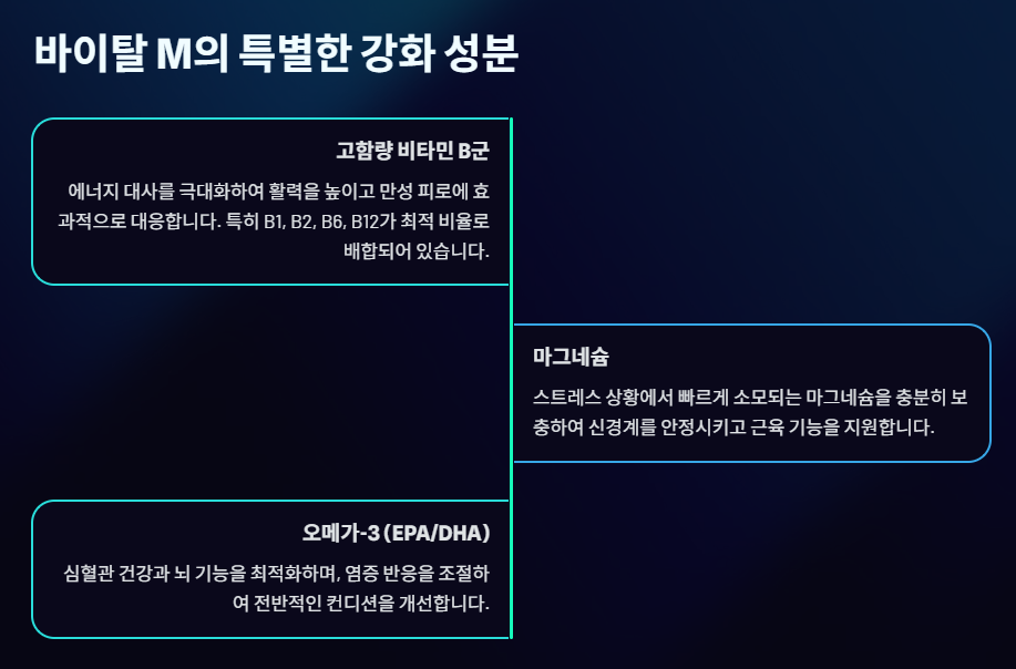 Vital M은 남성들이 주로 겪는 과도한 업무 스트레스와 체력 소모에 초점을 맞춥니다.