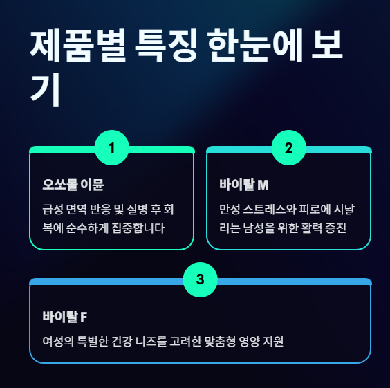 이 세 가지 제품의 핵심 차이는 '단순 면역 강화'를 넘어 '만성 스트레스 관리'와 '성별 특화 영양'으로 확장되는 데 있습니다.