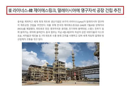 **희토류 자석 생산 공장 건설(투자금 약 2,000억 원)**이 시작되었습니다.