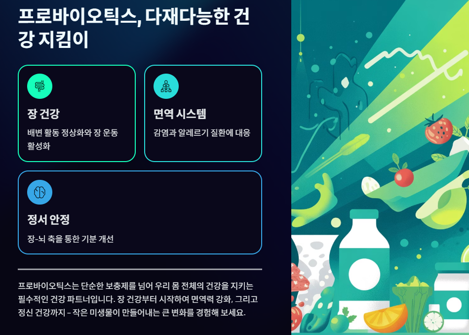 프로바이오틱스(유산균)는 배변 활동을 정상화하고 장 운동을 활성화하는 기본적인 효능을 넘어, 장내 면역 시스템을 강화하여 감염 및 알레르기 질환에 대응하며, 장-뇌 축을 통해 기분과 정서적 안정에까지 긍정적인 영향을 미치는 다재다능한 건강 지킴이입니다.