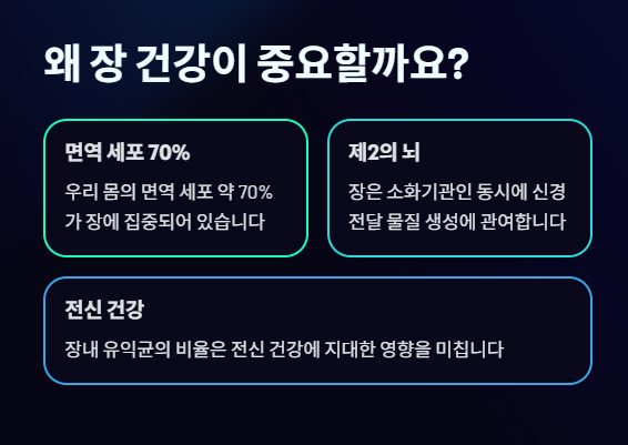 우리 몸의 면역 세포 약 70%가 장에 집중되어 있으며, 장은 소화기관인 동시에 **'제2의 뇌'**라고 불릴 만큼 신경 전달 물질 생성에 관여합니다. 따라서 장내 유익균의 비율을 높이는 프로바이오틱스 섭취는 전신 건강에 지대한 영향을 미칩니다.