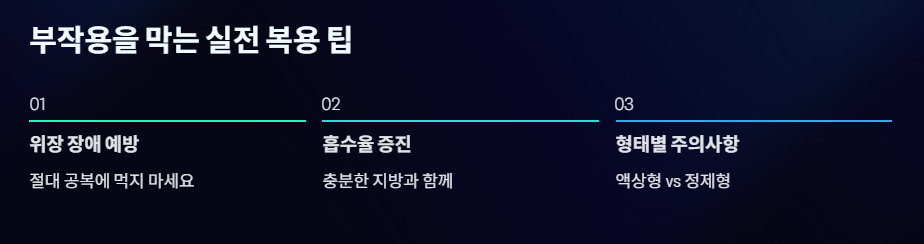 - 정제형: 성분이 섞여 있어 위장 부담이 덜하지만, 목 넘김이 불편할 경우 충분한 물과 함께 섭취하여 식도에 걸리지 않도록 주의해야 합니다.