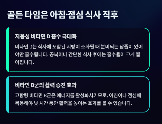 이뮨 비타민은 비타민 B군(수용성), 비타민 D(지용성), 그리고 미네랄(아연)을 모두 포함하고 있습니다. 이 세 가지 성분의 특성을 종합하여 최적의 시간을 정해야 합니다.