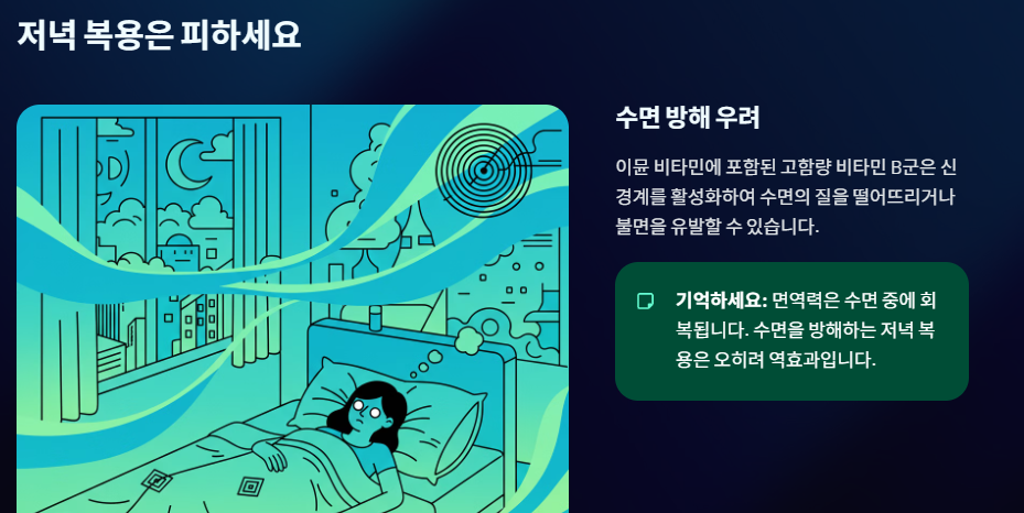 이뮨 비타민에 포함된 고함량 비타민 B군은 신경계를 활성화하여 수면의 질을 떨어뜨리거나 불면을 유발할 수 있습니다. 면역력은 수면 중에 회복되므로, 수면을 방해하는 저녁 복용은 피하는 것이 좋습니다.