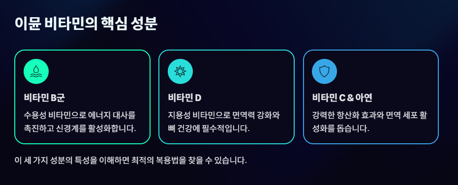 이 글에서는 이뮨 비타민의 주요 성분들이 우리 몸에서 어떻게 작용하는지 과학적 원리를 바탕으로 분석하고, 흡수율을 극대화하고 부작용은 최소화하는 최적의 복용 시간과 방법을 명확히 제시해 드립니다.