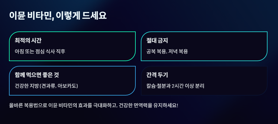 이뮨 비타민은 아침 또는 점심 식사 직후에 복용하여 지용성 비타민 D의 흡수와 비타민 B군의 활력을 극대화하세요. 절대 공복에 복용하지 말고, 고함량 칼슘제 등 다른 미네랄과는 2시간 이상 간격을 두는 것이 안전하고 효과적인 복용 전략입니다.