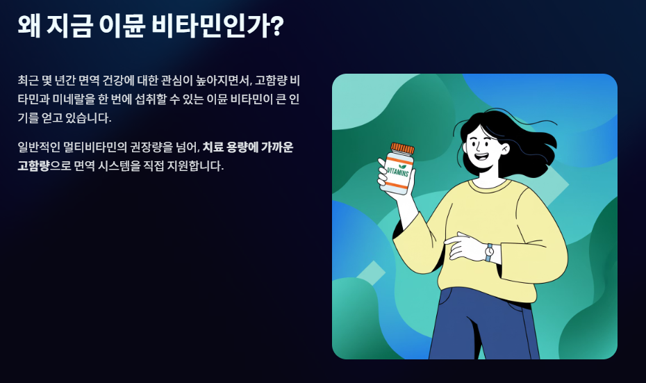 최근 몇 년간 면역 건강에 대한 관심이 높아지면서, 고함량 비타민과 미네랄을 한 번에 섭취할 수 있도록 설계된 이뮨(Immune) 비타민 제품이 큰 인기를 얻고 있습니다. 이 제품들은 일반적인 멀티비타민의 권장량(RDA)을 넘어, '치료 용량(Therapeutic Dose)'에 가까운 고함량으로 면역 시스템을 직접적으로 지원하는 것을 목표로 합니다.