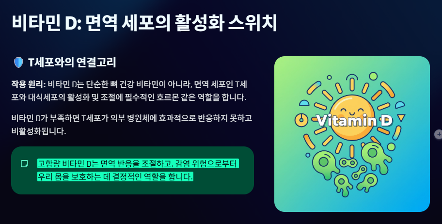 - 작용 원리: 비타민 D는 단순한 뼈 건강 비타민이 아니라, 면역 세포인 T세포와 대식세포의 활성화 및 조절에 필수적인 호르몬과 같은 역할을 합니다. 비타민 D가 부족하면 T세포가 외부 병원체에 효과적으로 반응하지 못하고 비활성화됩니다.