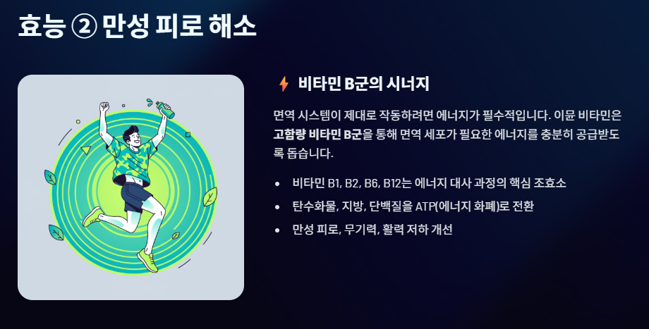 - 효능: 만성적인 피로감, 무기력증, 활력 저하 등은 에너지 대사 비효율에서 비롯되는 경우가 많습니다. 이뮨 비타민은 이 대사 효율을 끌어올려 빠른 활력 증진을 유도하며, 이는 곧 면역 세포의 에너지 공급으로 이어져 면역 활동을 간접적으로 지원합니다.