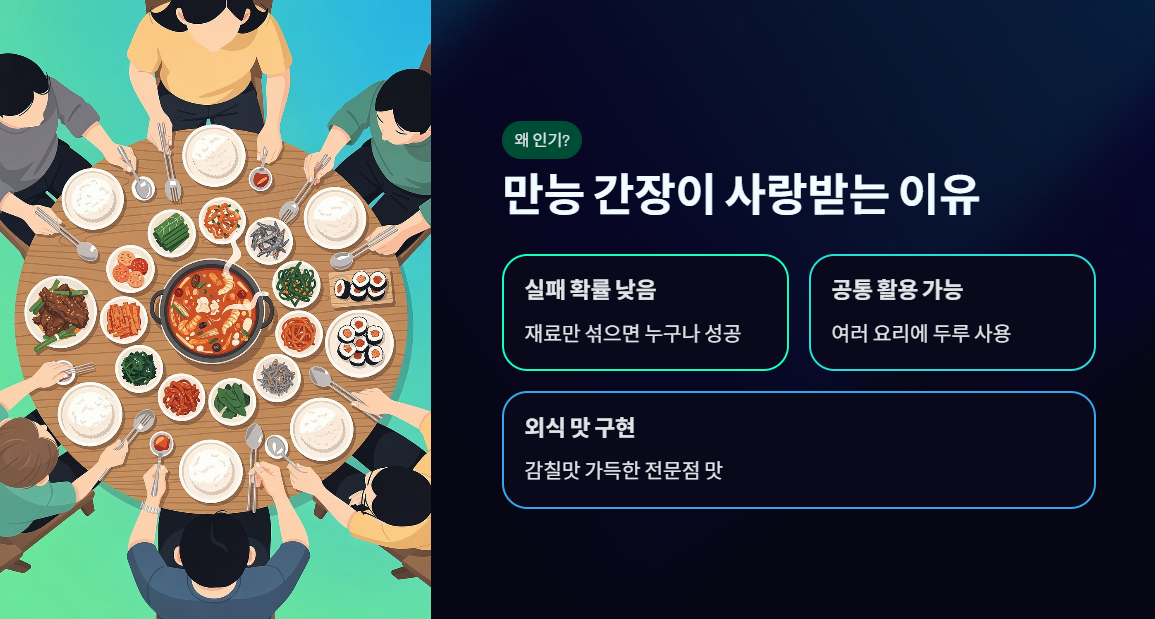 만능 간장은 요리를 잘 못하는 사람에게는 실패 없는 비법 소스이고, 요리를 즐기는 사람에게는 시간을 아껴주는 조력자입니다. 위 황금비율 중 입맛에 맞는 레시피 하나만 골라 활용해보세요.