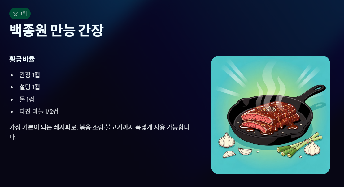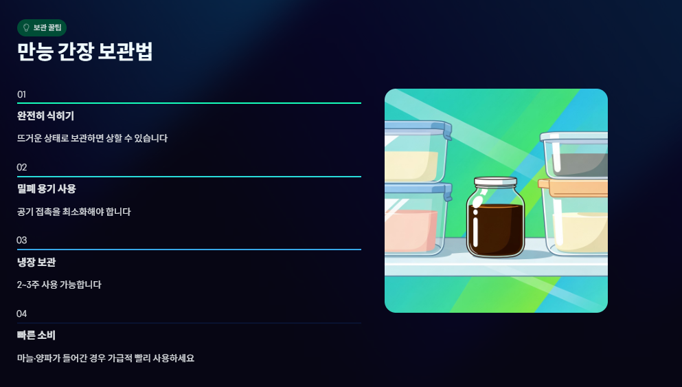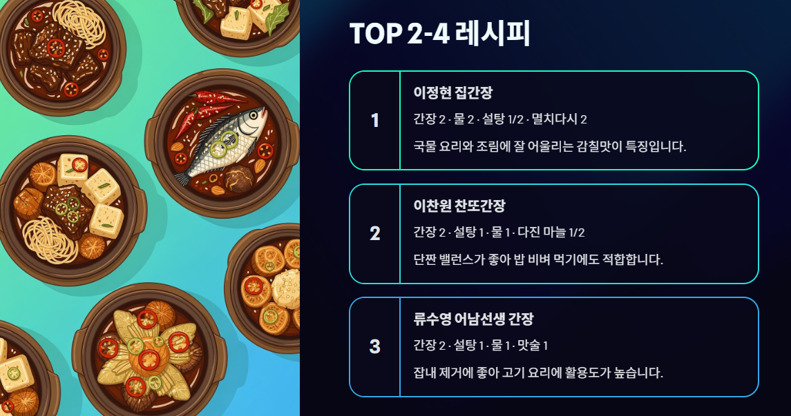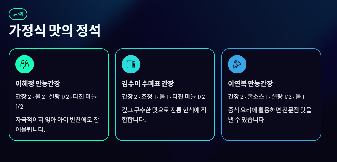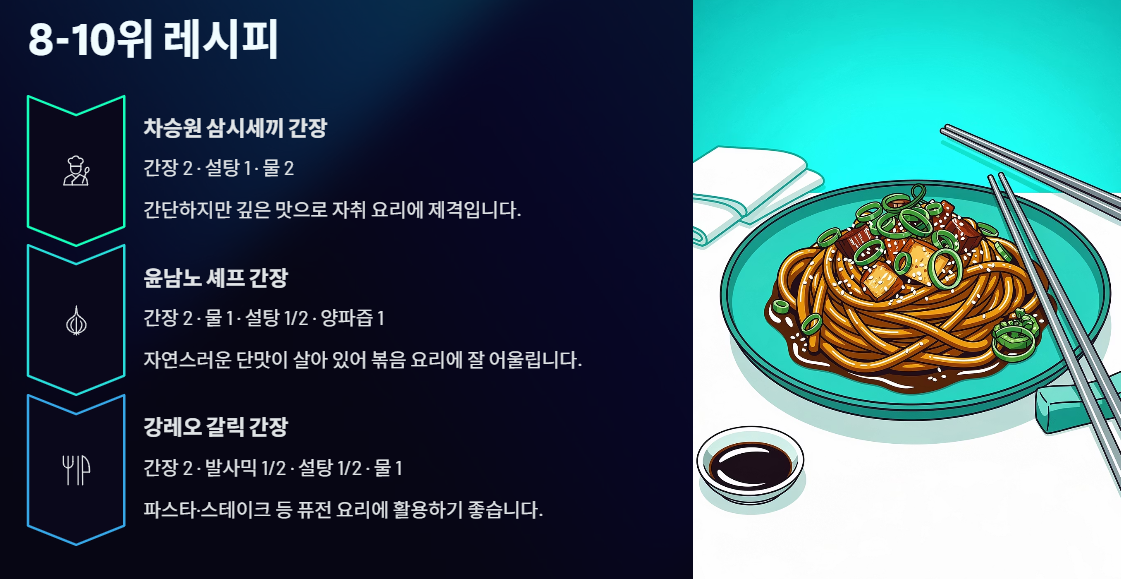 만능 간장은 요리를 잘 못하는 사람에게는 실패 없는 비법 소스이고, 요리를 즐기는 사람에게는 시간을 아껴주는 조력자입니다. 위 황금비율 중 입맛에 맞는 레시피 하나만 골라 활용해보세요.