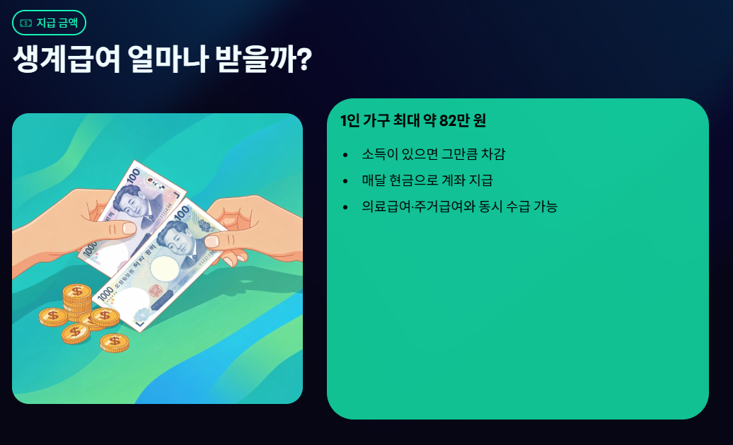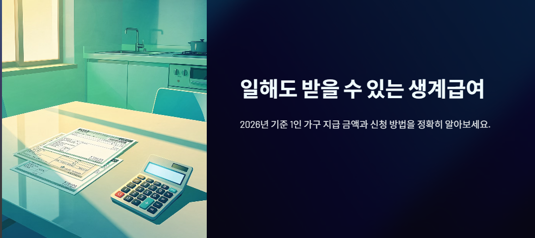 생계급여는 소득이 부족한 가구에 매달 현금으로 지급되는 기초생활보장제도입니다. 2026년 기준 1인 가구 지급 금액, 소득·재산 기준, 근로 중 수급 가능 여부와 주민센터 신청 방법까지 정확히 정리했습니다.