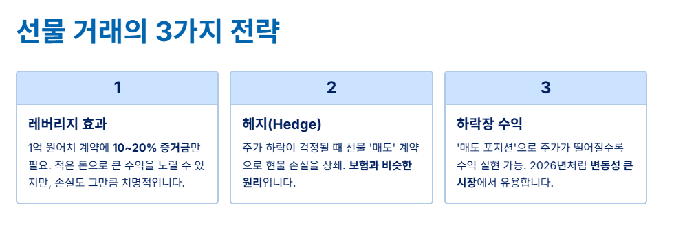 일반적인 주식 투자는 주가가 올라야만 돈을 법니다. 하지만 주식 선물은 **'매도 포지션'**을 잡을 수 있습니다. 즉, "미래에 이 가격에 팔겠다"라고 약속하는 것이기 때문에, 실제로 주가가 떨어지면 떨어질수록 수익이 나는 구조를 만들 수 있습니다. 2026년처럼 시장의 방향성을 예측하기 힘들 때 유용하게 쓰이는 전략입니다.