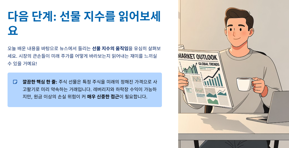 오늘 공부한 내용을 바탕으로 뉴스에서 들리는 선물 지수의 움직임을 유심히 살펴보세요. 시장의 큰손들이 미래 주가를 어떻게 바라보고 있는지 읽어내는 재미를 느끼실 수 있을 거예요!