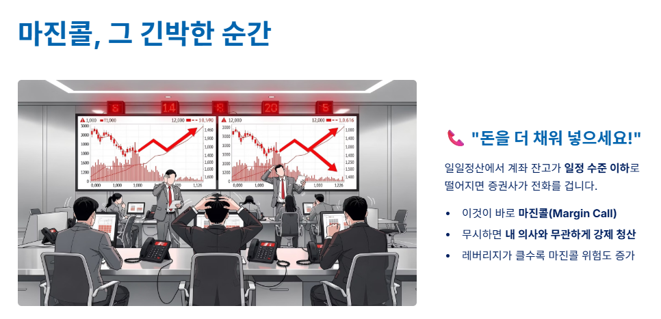 - 이를 **레버리지(지렛대)**라고 부르는데, 내 돈보다 훨씬 큰 금액을 굴릴 수 있어 수익이 날 때는 엄청난 수익률을 자랑하지만, 반대로 손실이 날 때도 그만큼 치명적입니다.