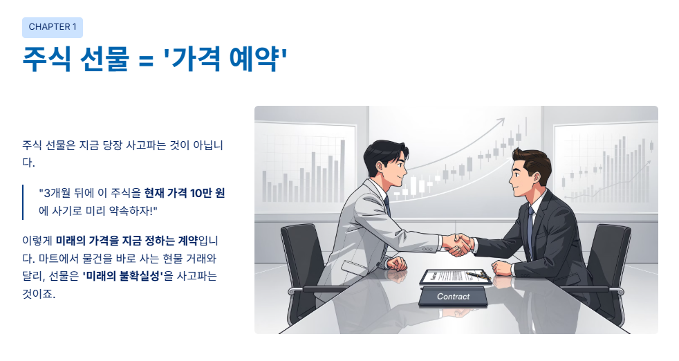 주식 선물은 지금 당장 주식을 사고파는 것이 아닙니다. **"3개월 뒤에 이 주식을 현재 가격인 10만 원에 사기로(혹은 팔기로) 미리 약속하자!"**라고 계약서를 쓰는 것과 같습니다.
