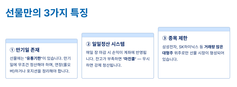 조금 더 깊이 들어가 볼까요? 주식 선물이 일반 주식과 다른 세 가지 구체적인 특징이 있습니다.